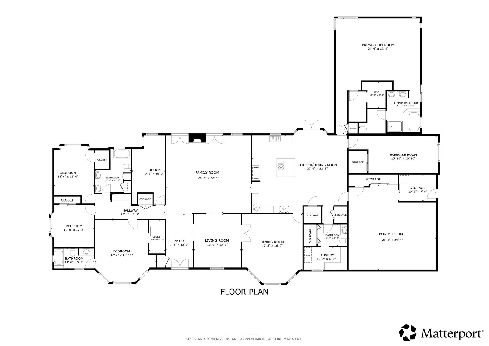 Set on a flat 5.35-acre lot, this single-story estate spans over 5,373 square feet with 6 bedrooms, one used as an office), a bonus room, and 3.5 baths — offering flexibility for family and guests alike.